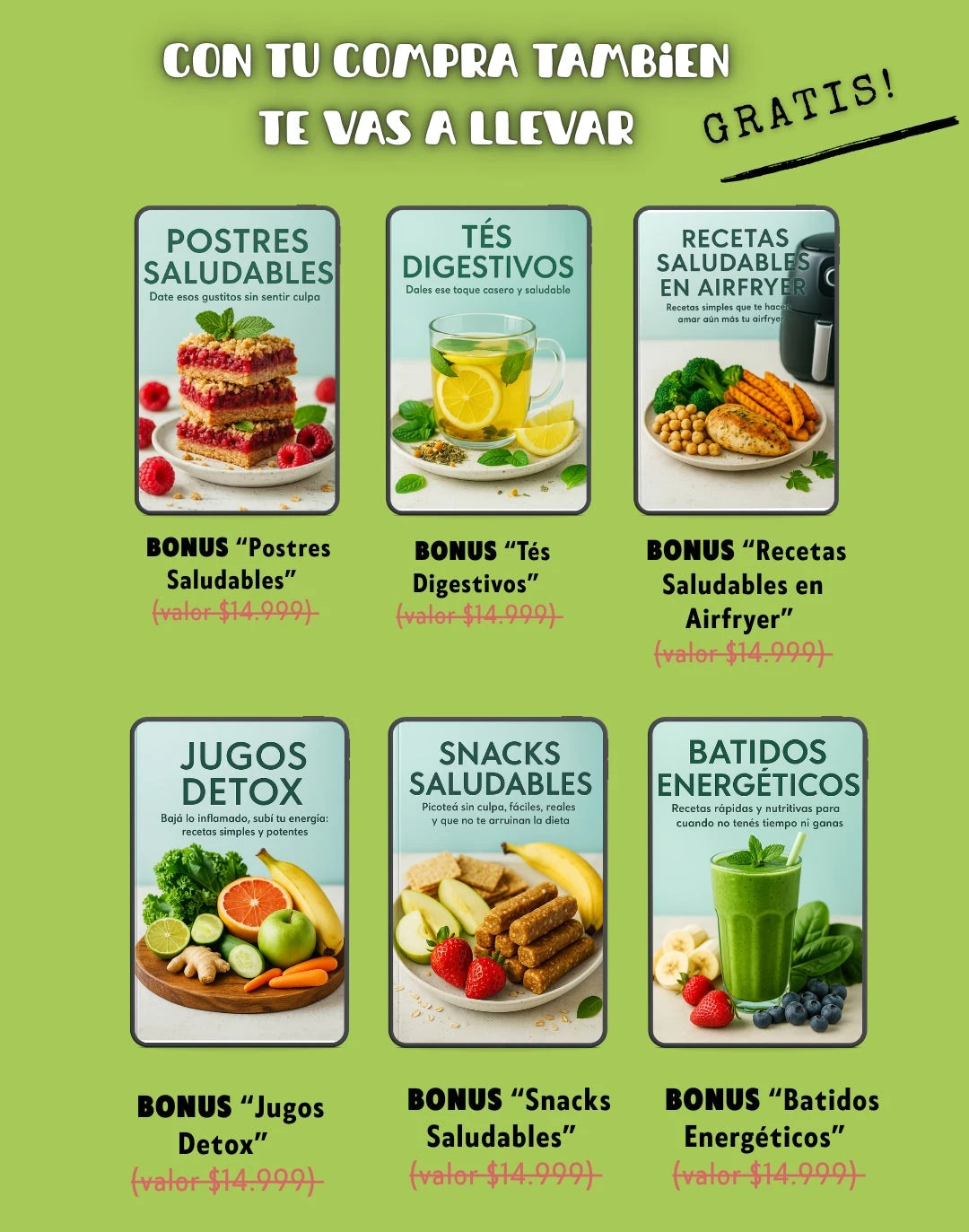 Si dentro de los próximos 7 días no sentís que este recetario te acerca a una alimentación que te hace bien —más liviana, menos inflamación, más energía—, te devuelvo todo tu dinero sin preguntas.